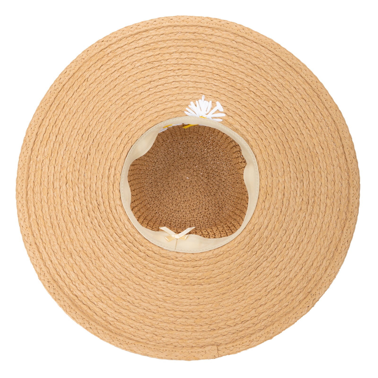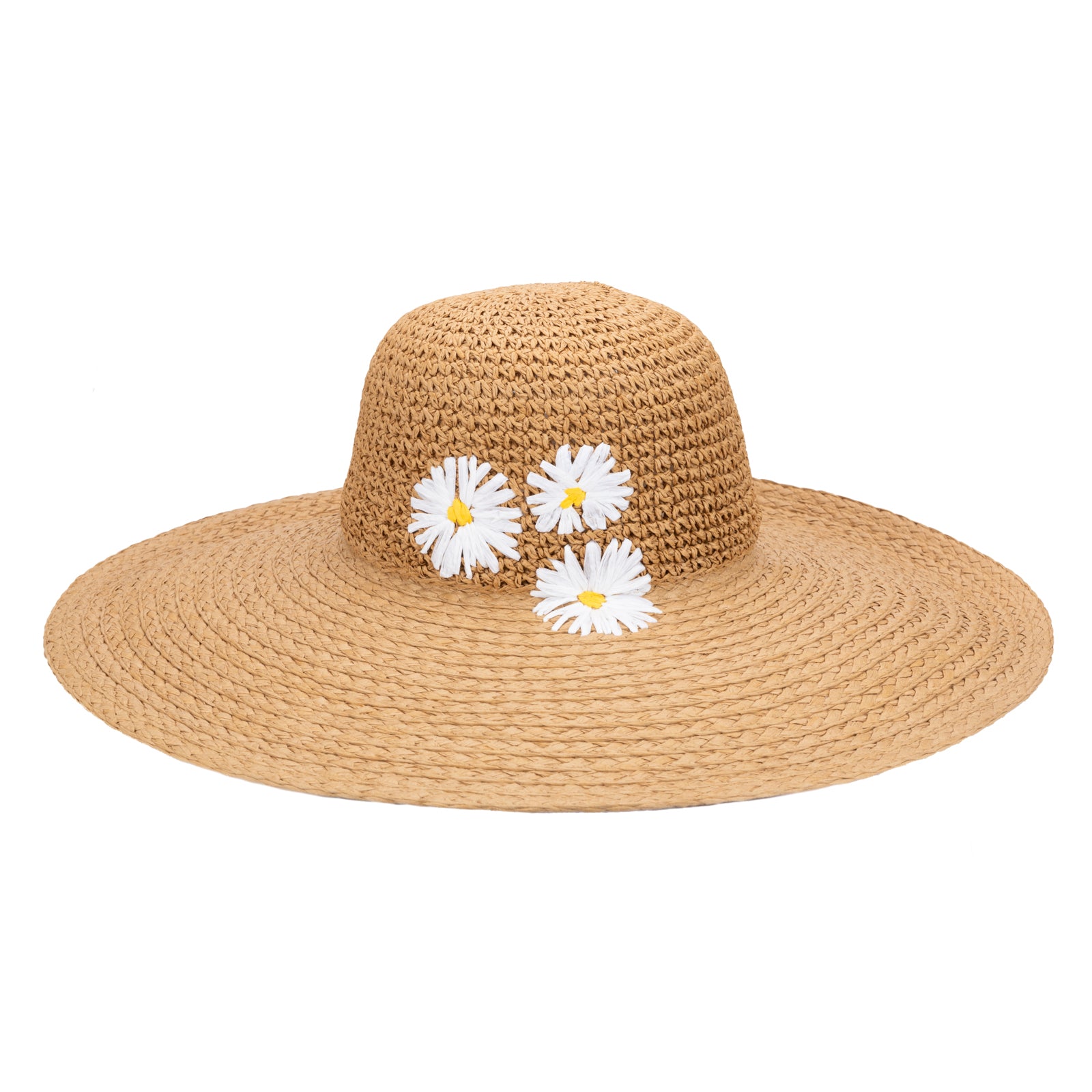 Handcrafted wide-brim hat featuring a structured round crown constructed from mixed paper crochet and braid. Delicate embroidered paper daisies accent the left side, adding refined botanical detail. A sophisticated piece that balances artisanal craftsmanship with practical sun protection.