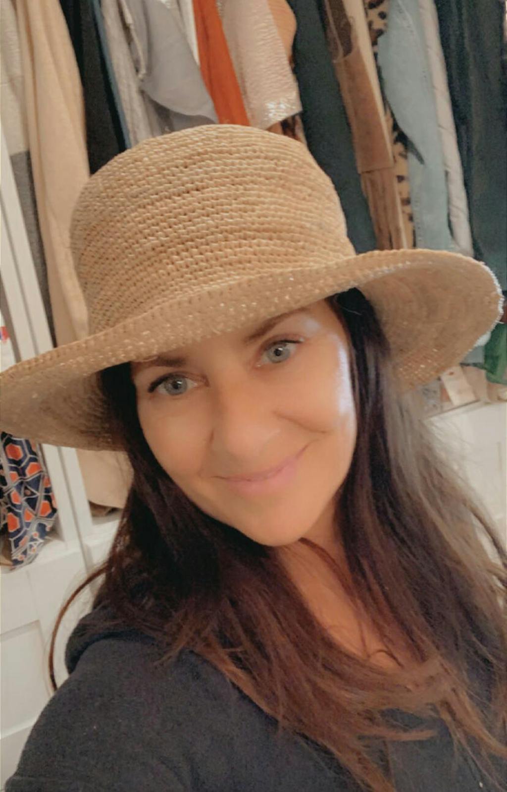 Woman holding a large brim hat in from of her face while standing on the beach.